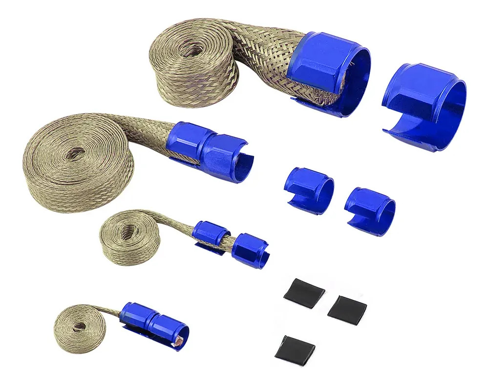Kit Malha Revestimento Inox Mangueira Radiador Terminais em alumínio com acabamento anodizado preto ou azul.